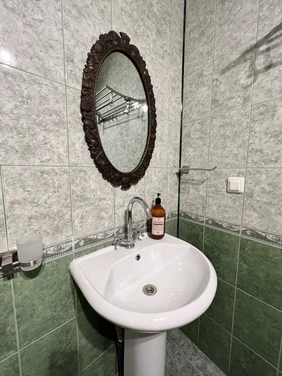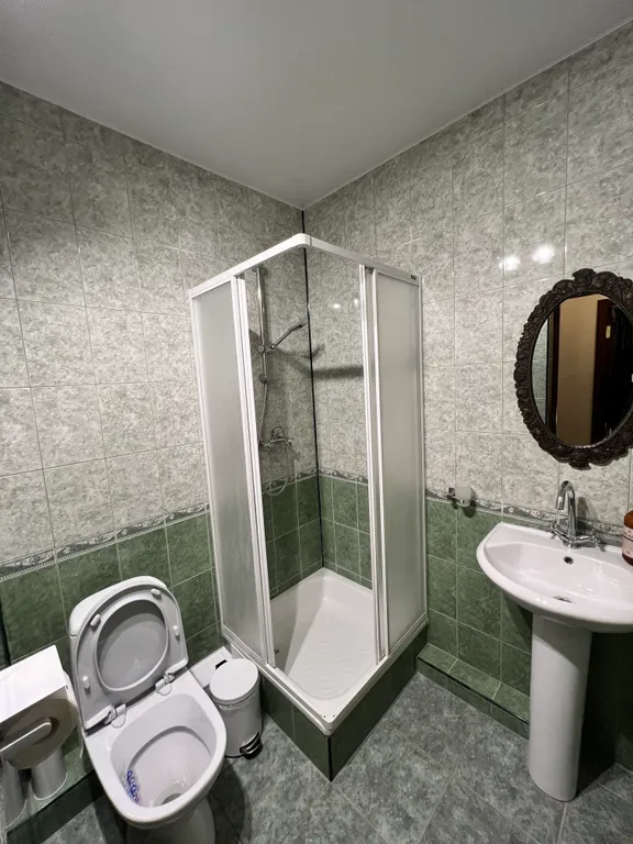 - Ванная комната с душевой кабиной и банными принадлежностями.