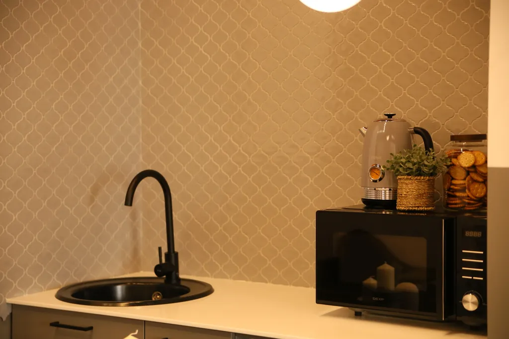 - Мини-кухня: свч, чайник, холодильник, раковина.